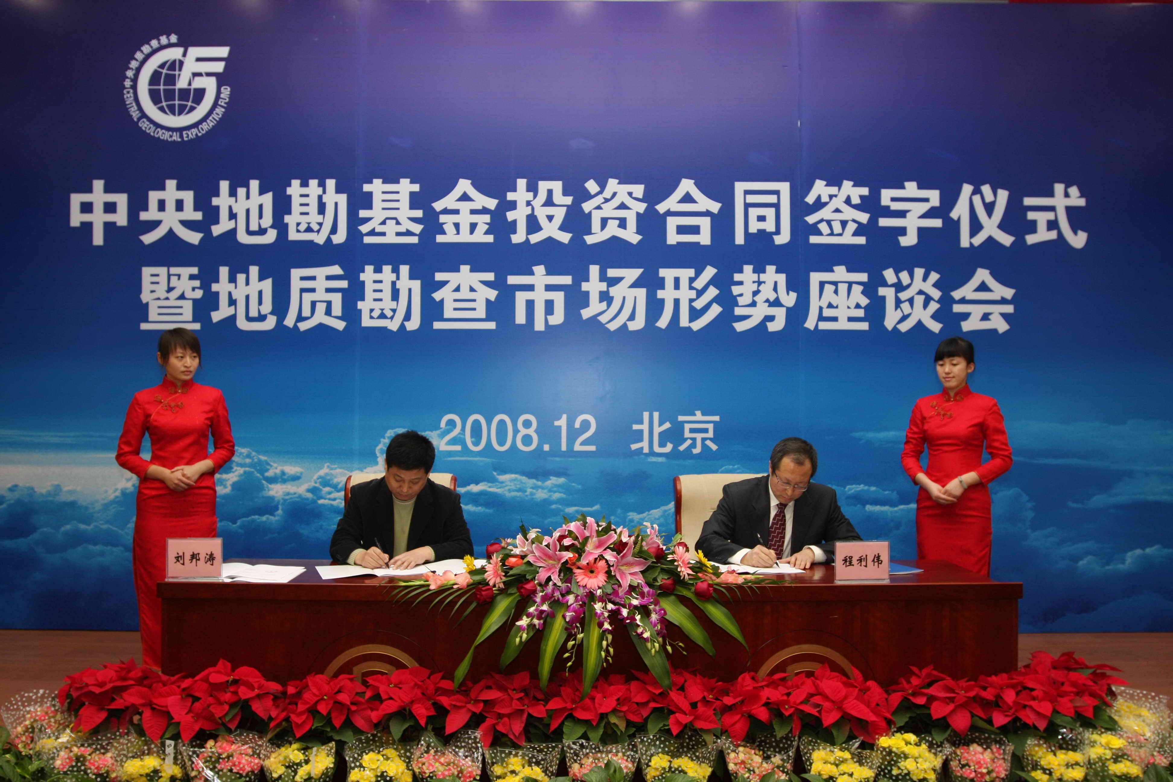 中央地质勘查基金首批合作勘查项目投资合同签字仪式暨地质勘查市场形势座谈会2008年12月3日在北京举行。来自22家单位的代表与国土资源部中央地质勘查基金管理中心主任程利伟共同在首批26个合作勘查项目的投资合同文本上签字。中央地勘基金项目投资合同的签订,标志着中央地质勘查基金权益管理及合同制管理迈出了实质性的一步,这对建立和完善适应市场经济要求的地勘基金管理运行机制、维护国家以及合作各方的权益、规范地勘基金投资项目的运作,都有十分重要的意义。